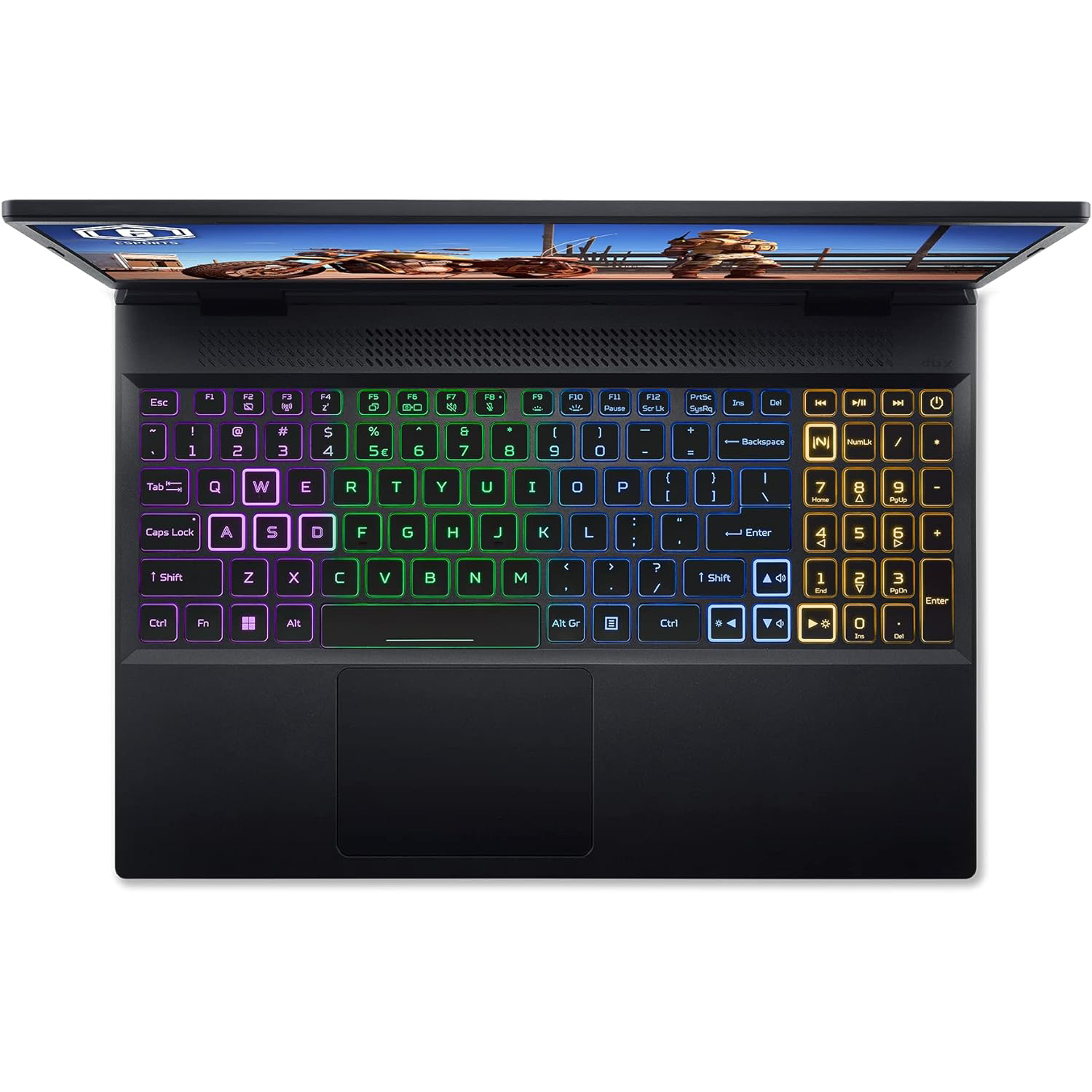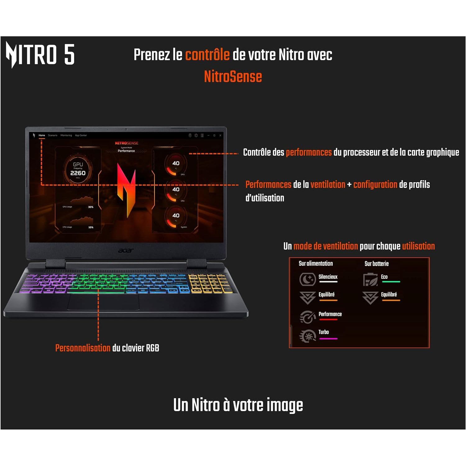 Ce laptop gaming est équipé d’un clavier rétroéclairé RGB à 4 zones et des technologies Acer NitroSense & Acer CoolBoost pour contrôler les fonctionnalités essentielles du système et jouer en toute fluidité.