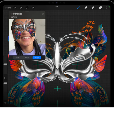 Caméra avant. L’iPad Pro est doté d’un objectif ultra grand-angle avec un capteur de 12 Mpx et un champ de vision de 122°, parfait pour prendre des photos et filmer des vidéos à poster sur les réseaux sociaux, passer des appels FaceTime avec Cadre centré ou réussir des selfies spectaculaires en mode Portrait. Et il fonctionne avec la caméra TrueDepth pour déverrouiller votre iPad Pro en toute sécurité avec Face ID.