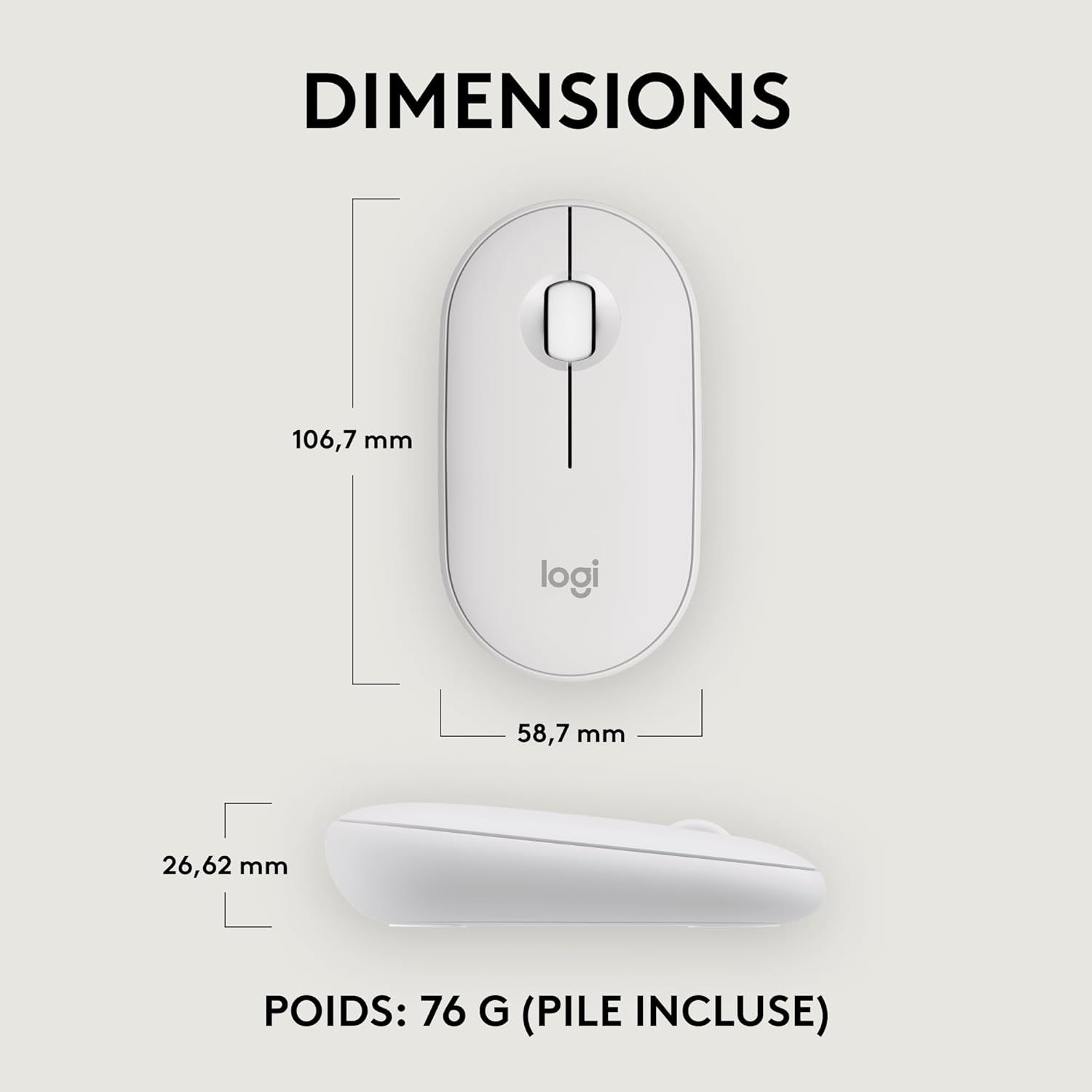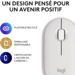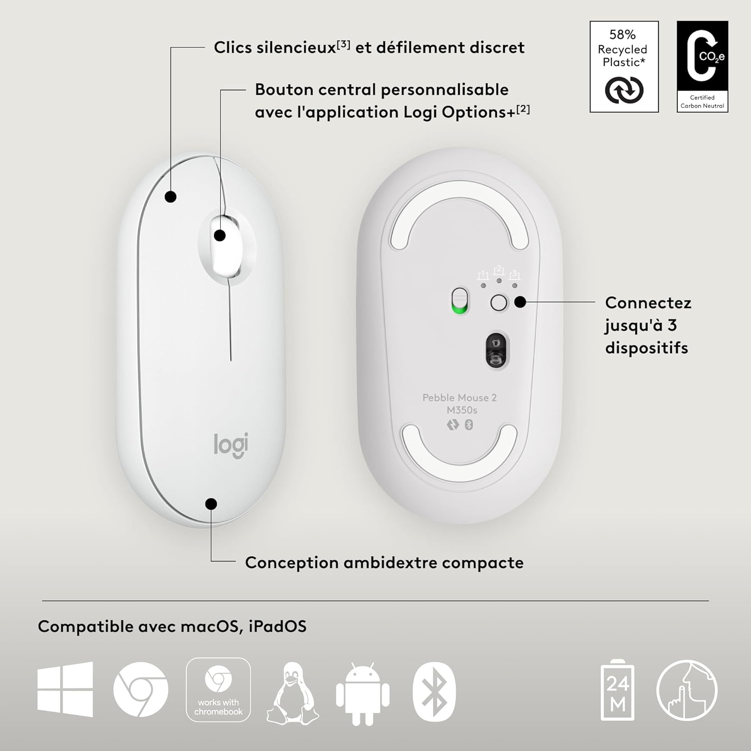 La Logitech Pebble 2 M350s est une souris moderne et silencieuse conçue pour s’adapter à votre style de vie nomade. Avec sa forme organique lisse, elle tient facilement dans votre poche ou votre sac, offrant une prise en main confortable où que vous soyez. Grâce à ses clics et son défilement silencieux, vous pouvez travailler en toute discrétion, sans perturber votre entourage.Dotée de trois boutons silencieux et de la technologie Silent Touch, cette souris offre le même confort de clic que vous appréciez, mais avec beaucoup moins de bruit. Vous pouvez la connecter via Bluetooth ou avec un récepteur USB Logitech (non fourni), offrant une portée de 10 mètres pour une utilisation pratique avec votre ordinateur.